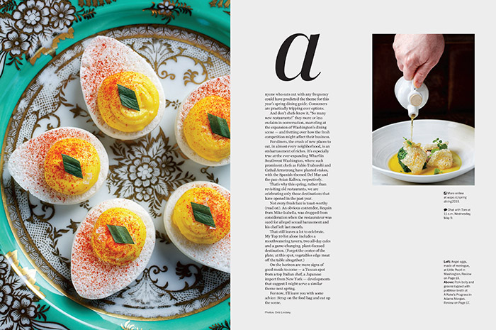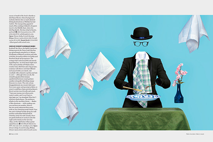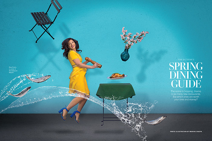 For the Spring dining guide, worked together with photo editor Jennifer Beeson Gregory to assign and produce surrealist photo illustrations.