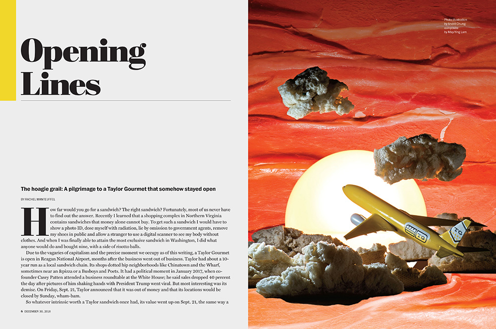 For a story about the last remaining restaurant in the Taylor Gourmet chain, assigned and styled a photo illustration of a plane flying into a meat sunset.