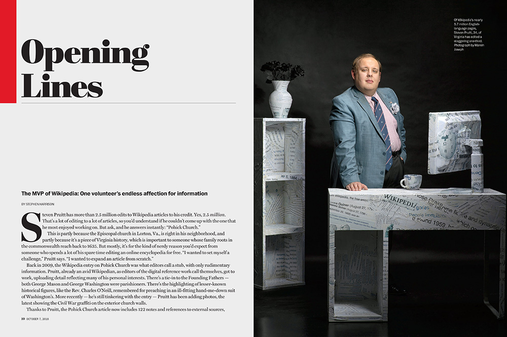 For a story about the most prolific English language contributor to Wikipedia, Steven Pruitt, I assigned, styled and papier-mâchéd furniture with his articles.