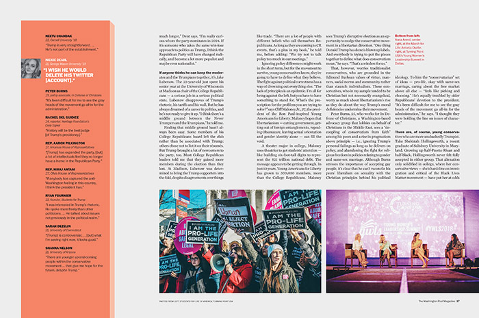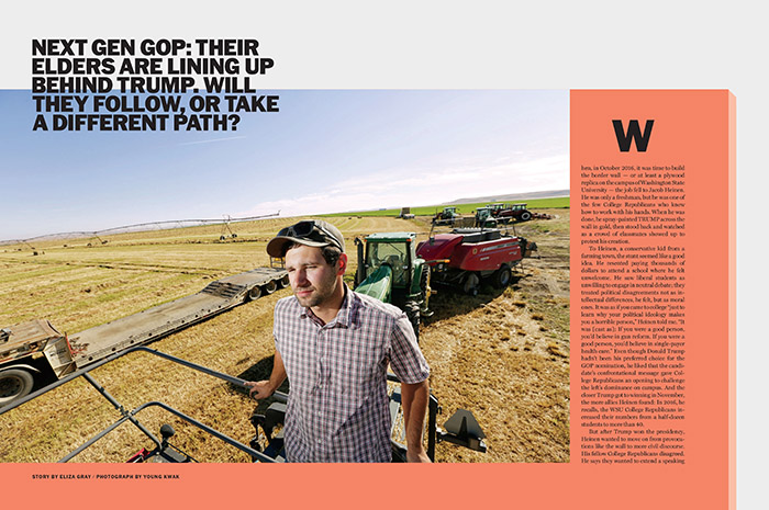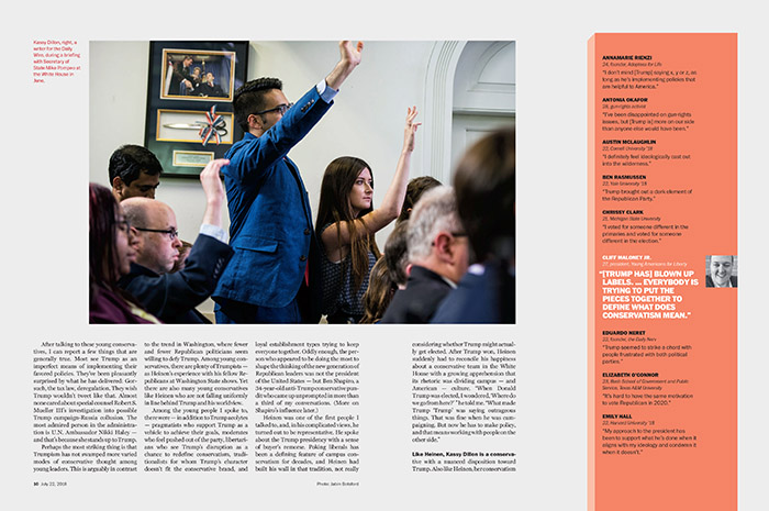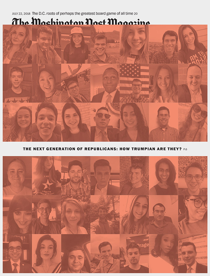 For a story about the next generation of Republicans and finding their footing in the age of Trump, acquired selfies from the subjects for a cover treatment. Also commissioned reportage of key voices in the story.