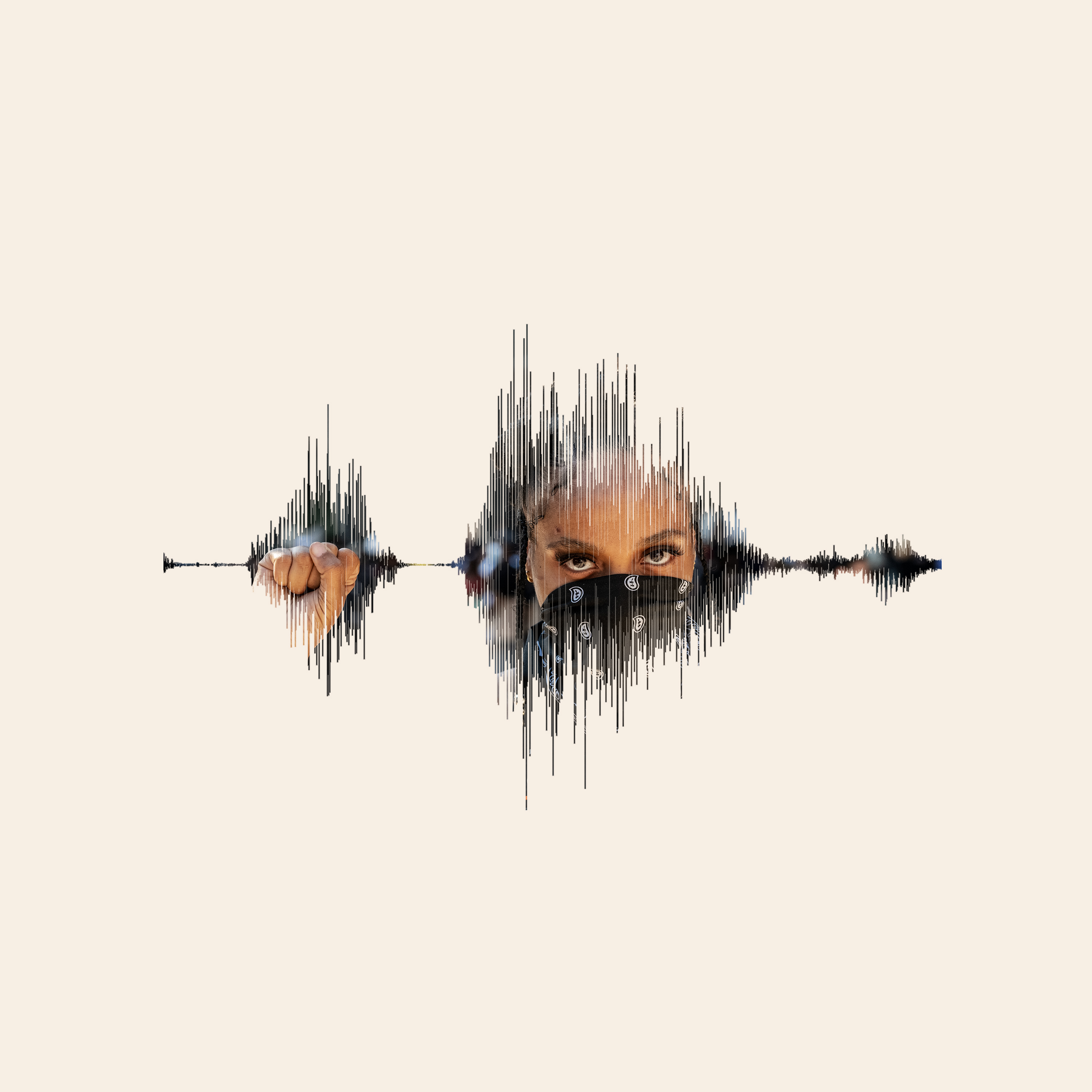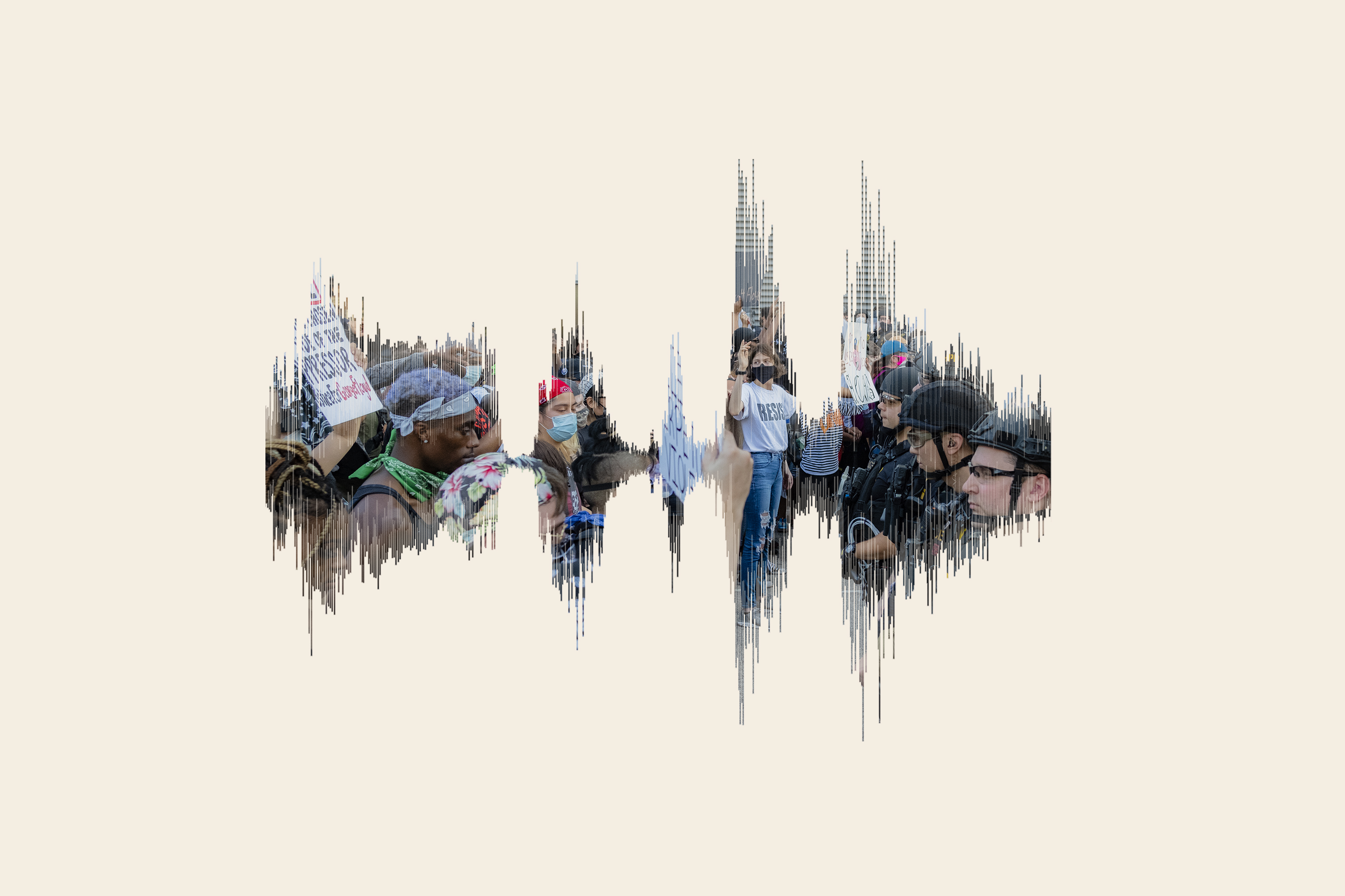 The faces of protesters in the aftermath of his death, as seen within the sound waves of George Floyd’s final words. These images pay homage to the voice — how the gut-wrenching sounds of Floyd begging for his life led to protesters speaking out. And continuing the cycle, people have begun to discuss how to reform policing, and look inward at their own biases.